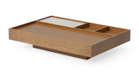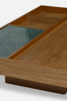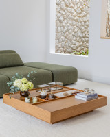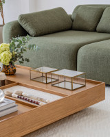 A mesa de centro Pauta traz equilíbrio e harmonia ao ambiente. Produzida em MDF revestido em lâmina de madeira natural, a peça é complementada por detalhes em pedra, MDF lâminado ou laqueado, e oferece também a opção de recouro, criando uma composição única de texturas.