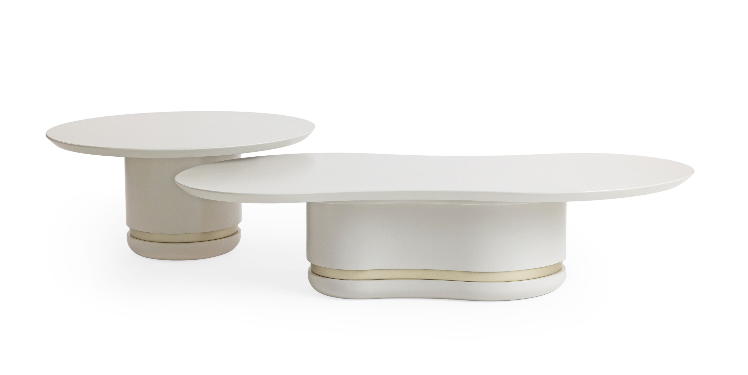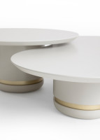 A mesa Plure destaca-se por ser produzida em MDF revestido com lâmina natural de madeira ou com acabamento laqueado. O diferencial inclui um detalhe em baixo relevo em tons metalizados, oferecendo um toque refinado. Disponível em duas opções, uma com tampo e base redondos e outra com um formato orgânico.