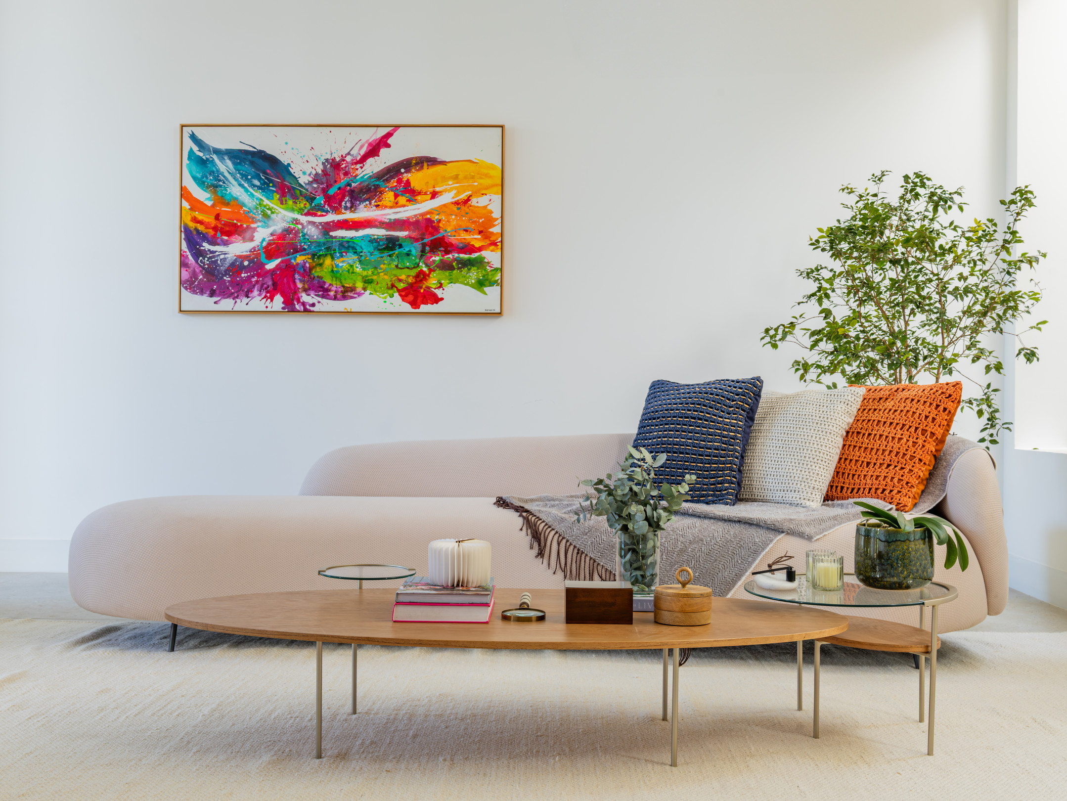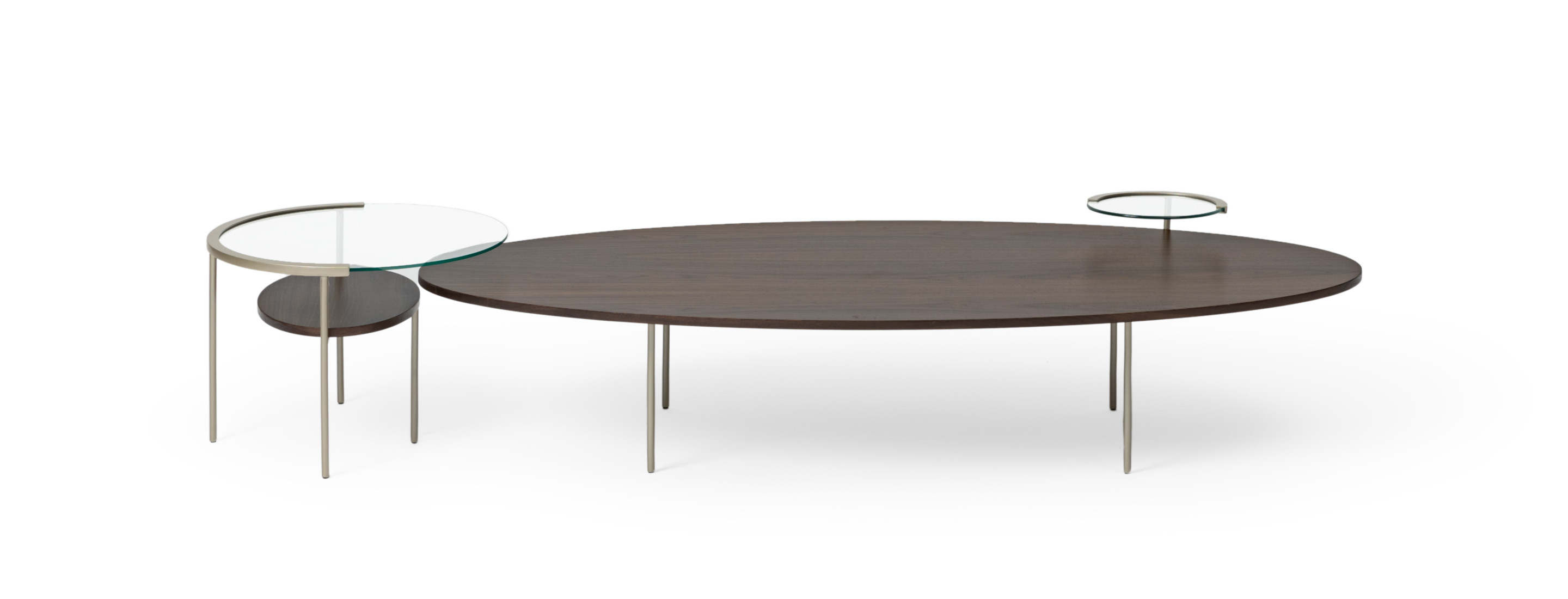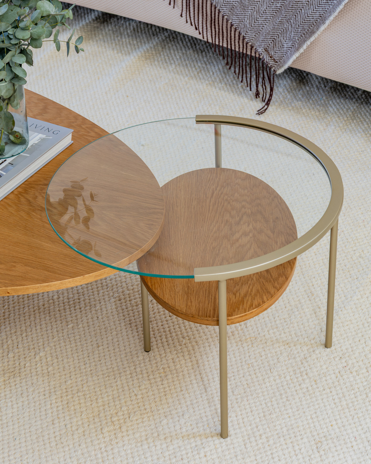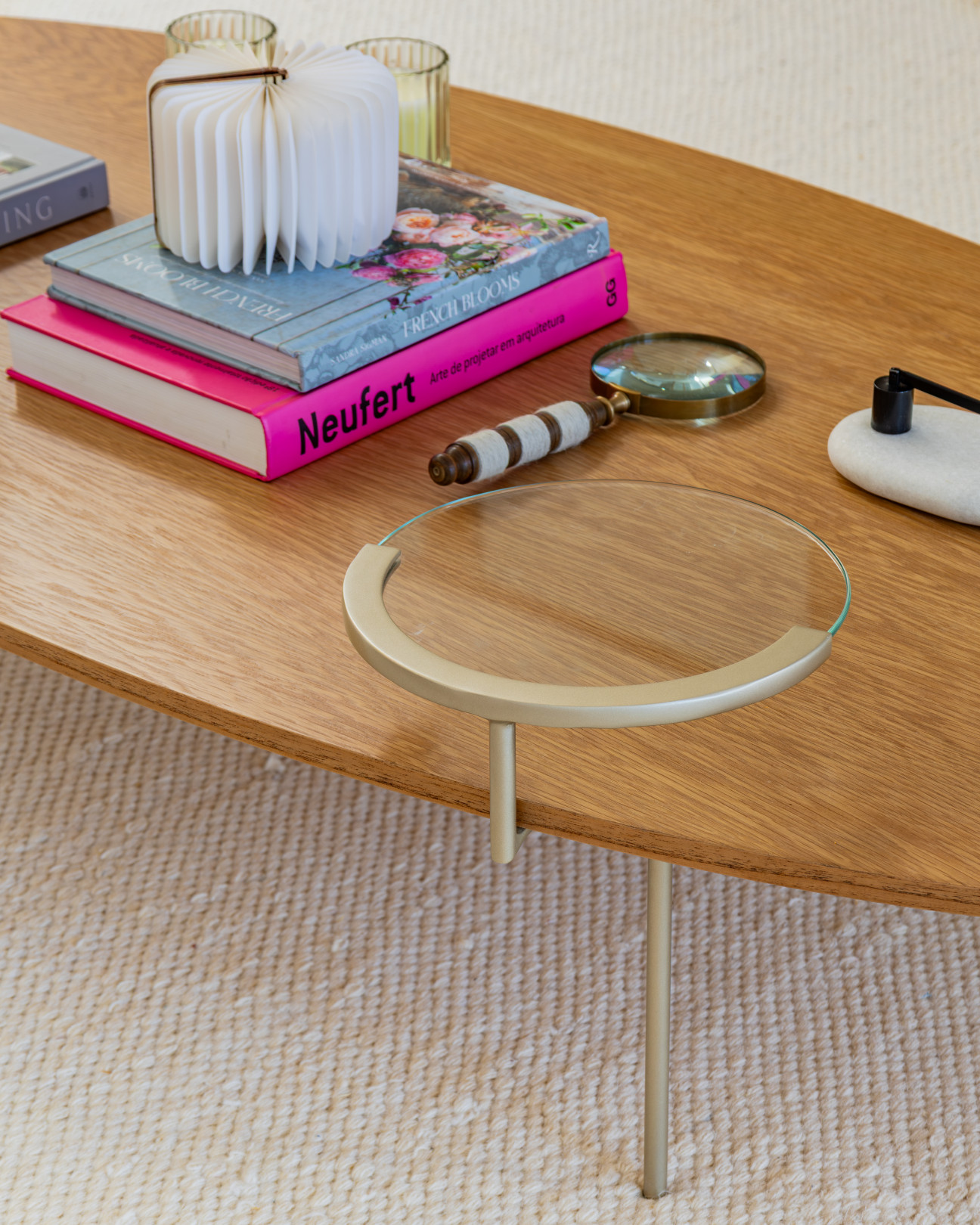 A Mesa de Centro Timbre está disponível em duas opções. A opção menor (A) apresenta um tampo de vidro, acompanhado de uma estrutura metálica e uma prateleira de MDF laqueado ou laminado. Já a mesa (B) possui uma estrutura em aço carbono, com tampo revestido em lâmina de madeira natural ou MDF laqueado, e um vidro sobreposto ao tampo, que é envolto por uma estrutura metálica.