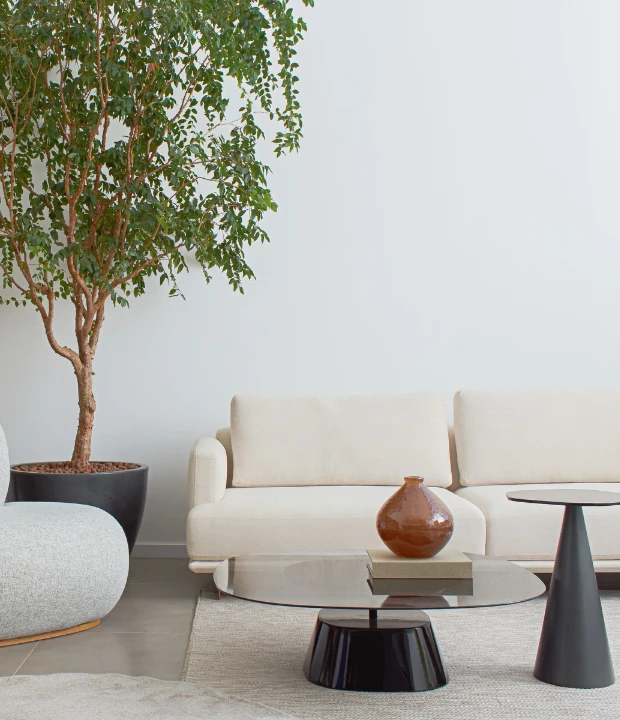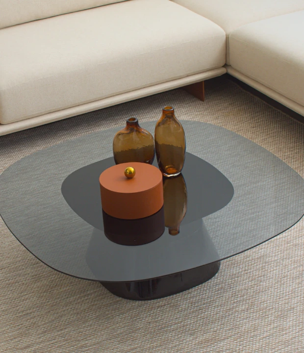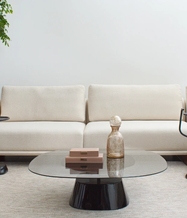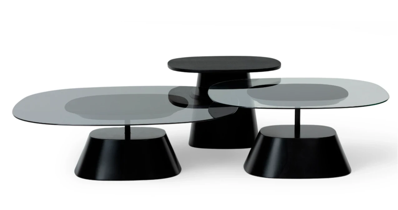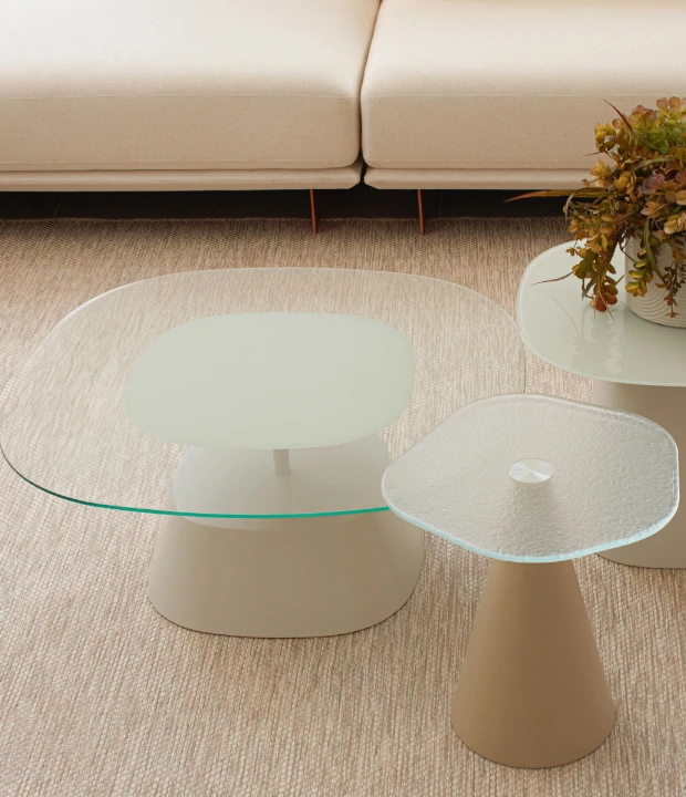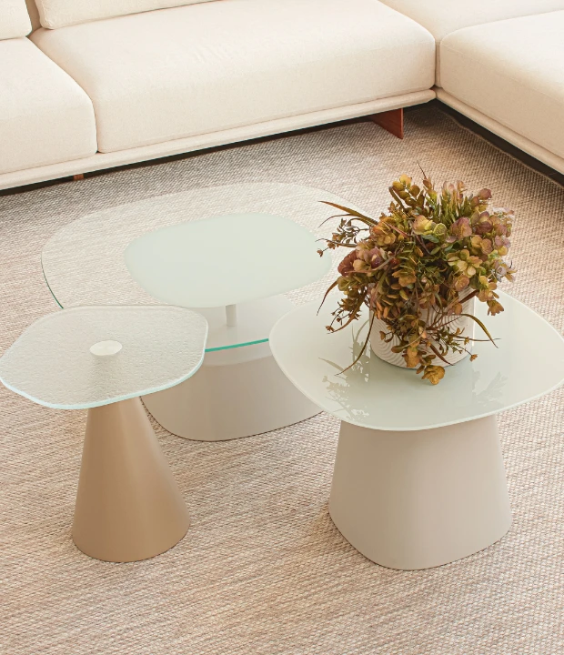 A mesa de centro Valsa é uma harmônica composição com três tamanhos diferentes. Inspirada na graça e fluidez da valsa, as mesas (A) e (B) possuem tampo com vidro translúcido ou fumê, com pintura no centro, além de haste metálica e base com acabamento laqueado. A mesa (C) é produzida em MDF laqueado ou laminado.