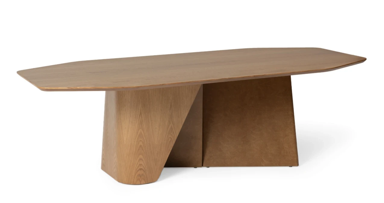 A mesa de jantar Adágio possui base central formada por planos verticais e inclinados que criam uma geometria surpreendente. Revestida com lâmina natural de madeira e recouro no centro, a base oferece um efeito visual sofisticado, que varia conforme o ângulo de visão. O tampo octogonal, com laterais delgadas e cantos arredondados, completa o design leve e refinado.