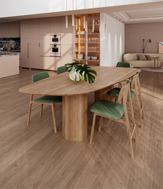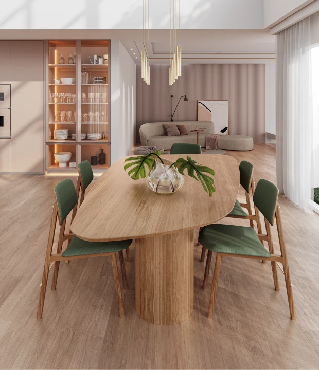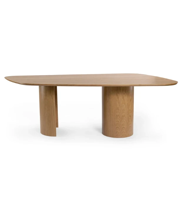 A mesa de jantar Jabuti possui tampo em formato orgânico e pés assimétricos. É confeccionada em lâmina natural de madeira ou com acabamento em laca.