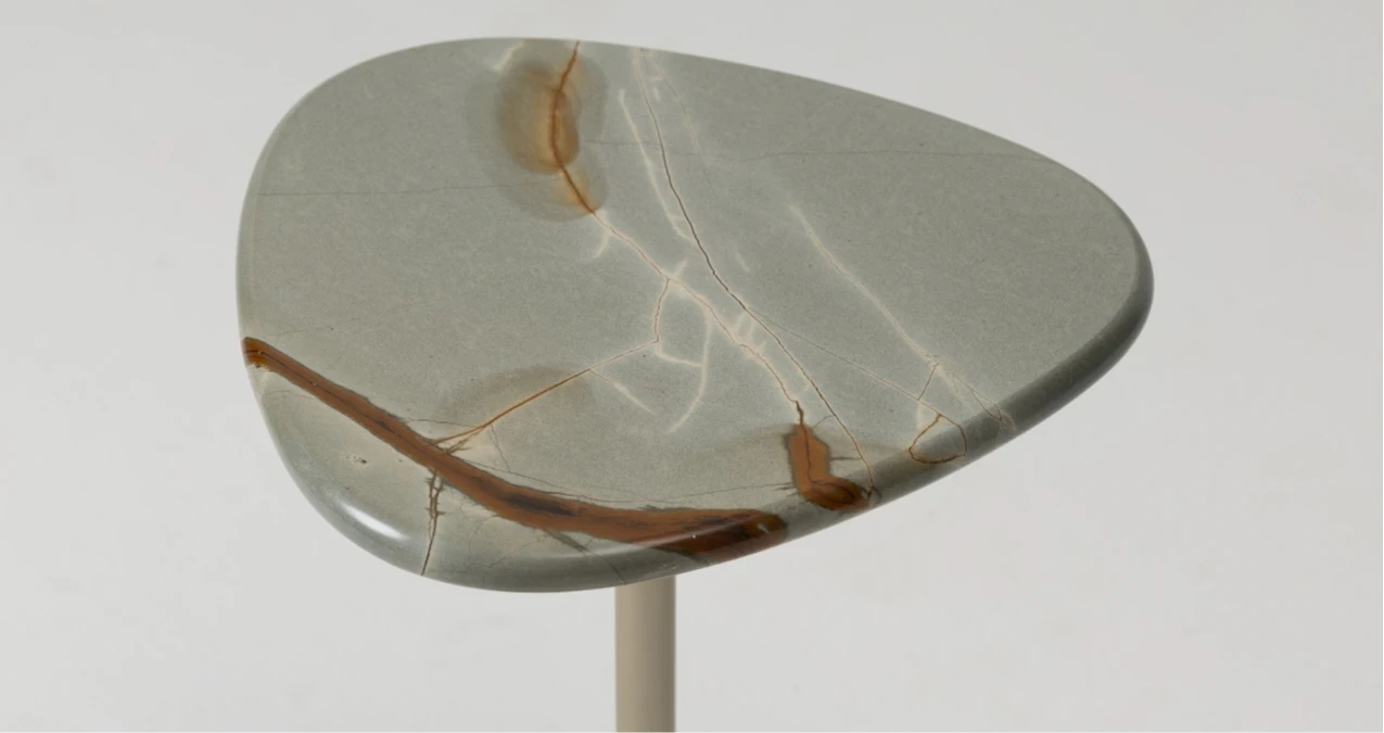 A Mesa Lateral Alva transmite leveza estrutural. Sua base em metal laqueado sustenta o tampo em formato de palheta, disponível em pedra natural.