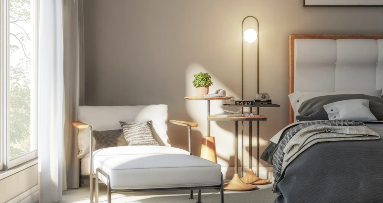 A mesa lateral Beta é confeccionada com estrutura metálica. Possui base de madeira maciça e tampo sobreposto de MDF revestido com lâmina natural de madeira.