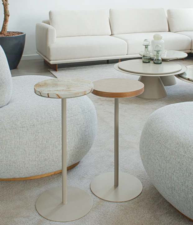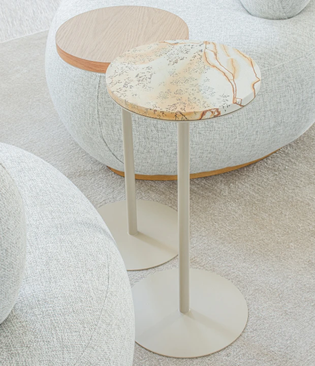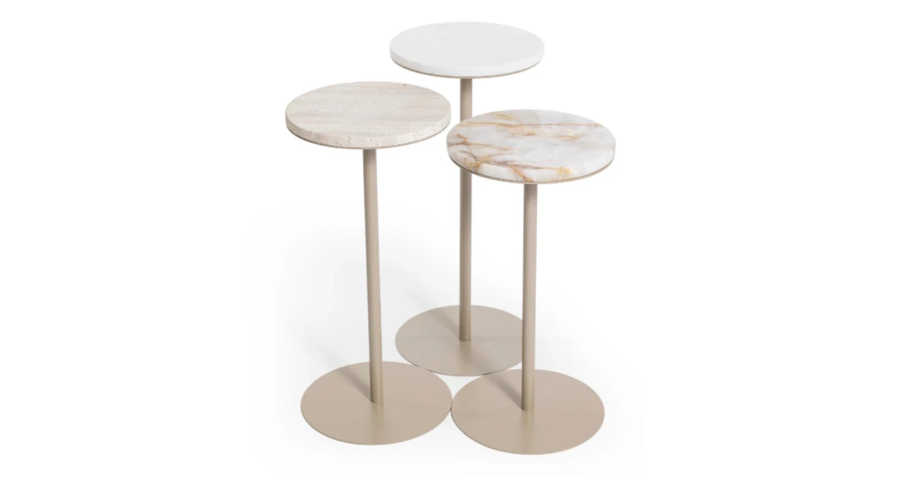 A mesa lateral Cristal possui estrutura metálica e tampo em pedra natural. Há quatro opções de pedras: travertino, onix, branco acetinado e preto escovado.