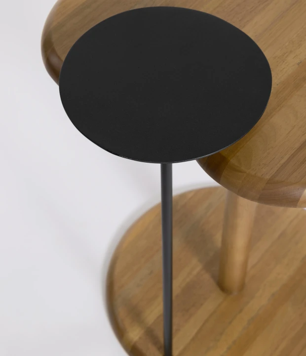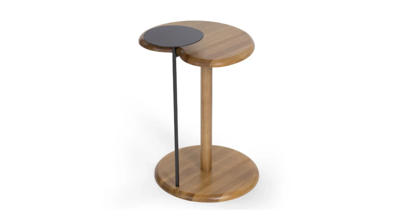 A mesa lateral Dueto é confeccionada em madeira maciça e apresenta diferentes tons em seu tampo e sua base, resultado de um processo manual de prensagem. Sua composição é feita a partir de dois tampos em materiais e alturas diferentes, trazendo um harmônico contraste entre o aço e a madeira.
