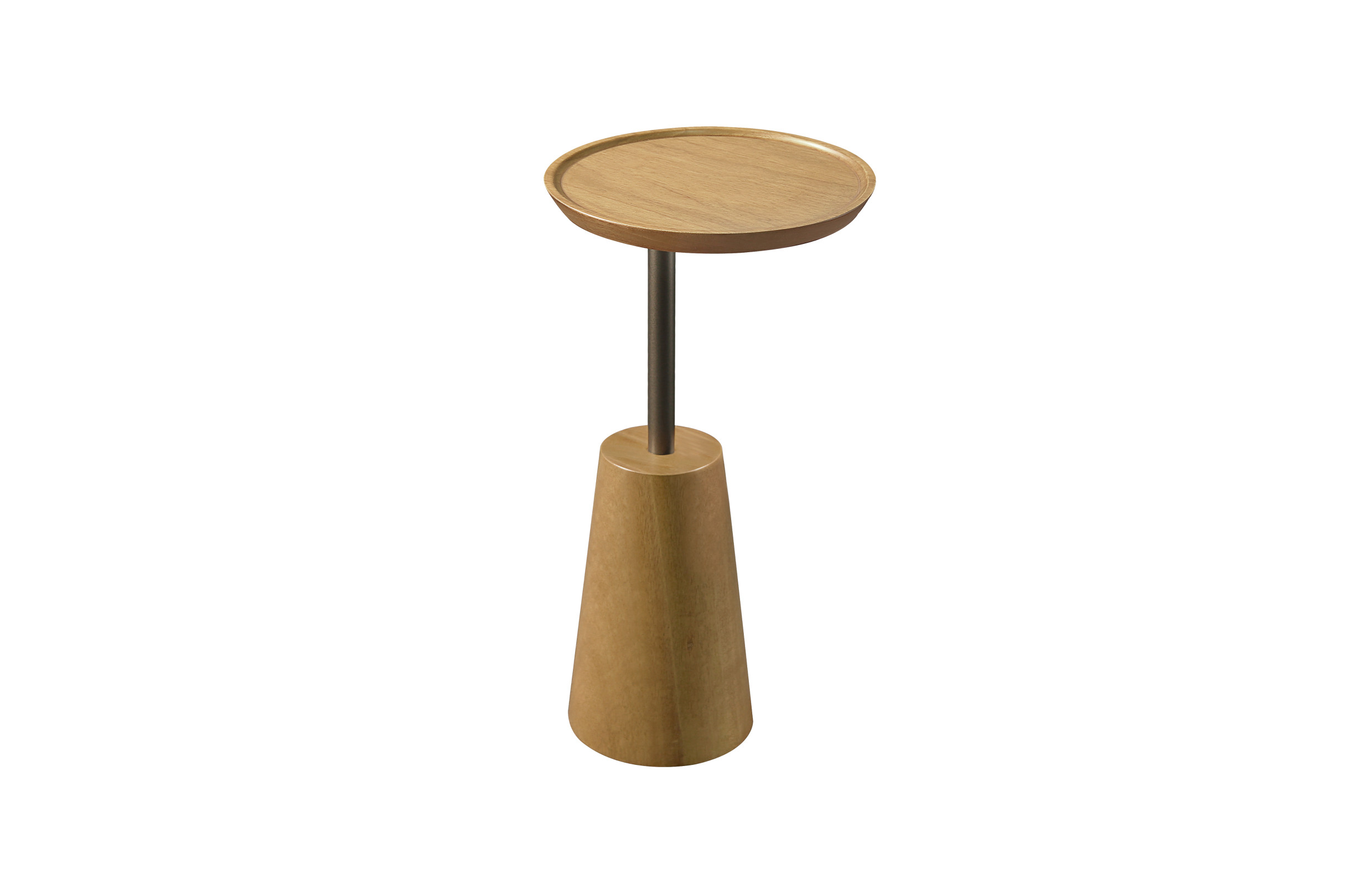 A mesa lateral Gama possui haste metálica, tampo e base em madeira maciça.