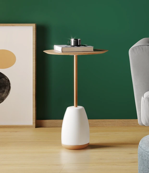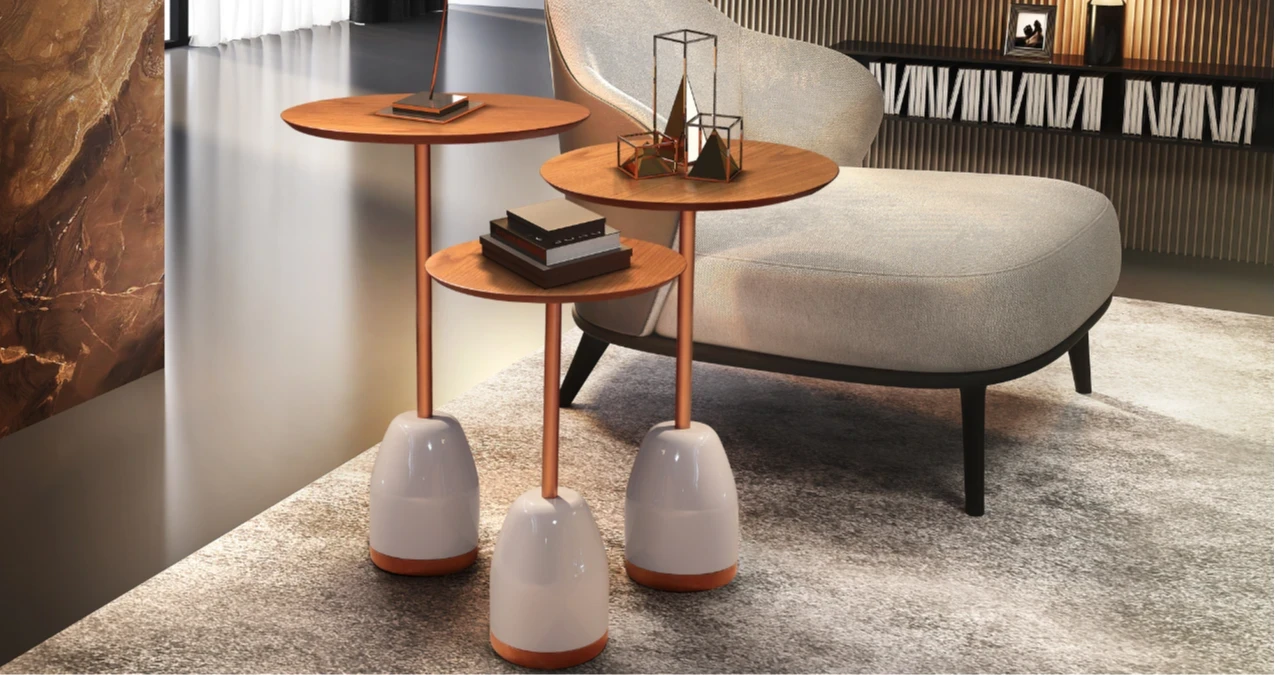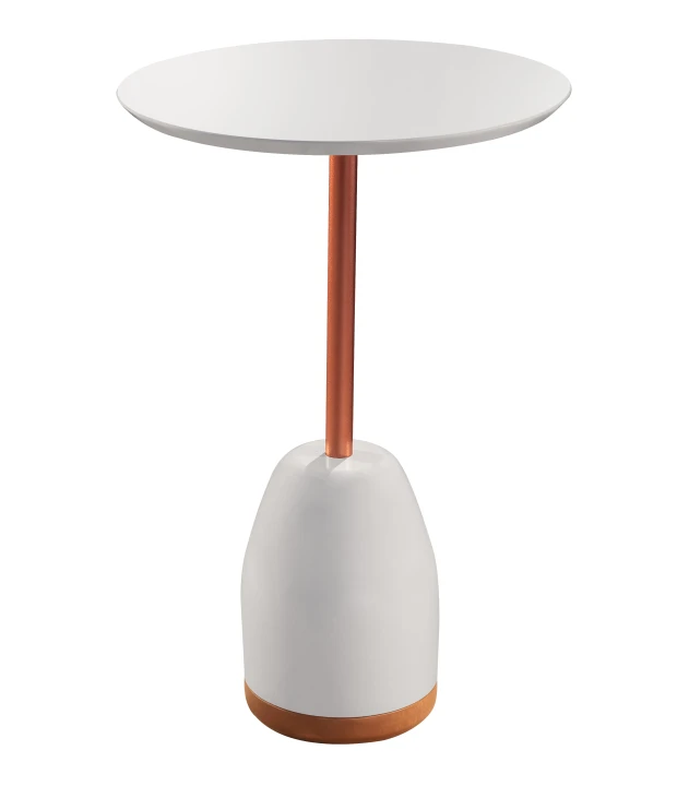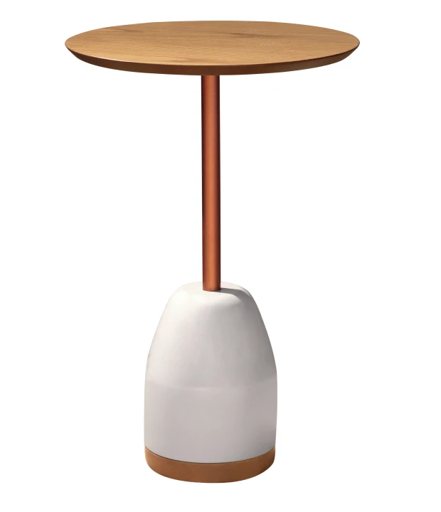 A mesa lateral Olinda possui tampo de MDF laqueado ou revestido com lâmina natural de madeira, haste metálica e base de MDF laqueado com detalhe em madeira maciça.