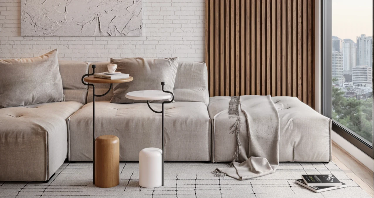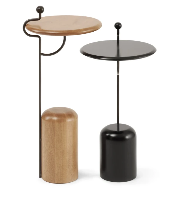 A mesa lateral Órbita possui tampo e base em madeira maciça ou em MDF laqueado. Sua estrutura é feita em aço carbono com ponteira em madeira laqueada.