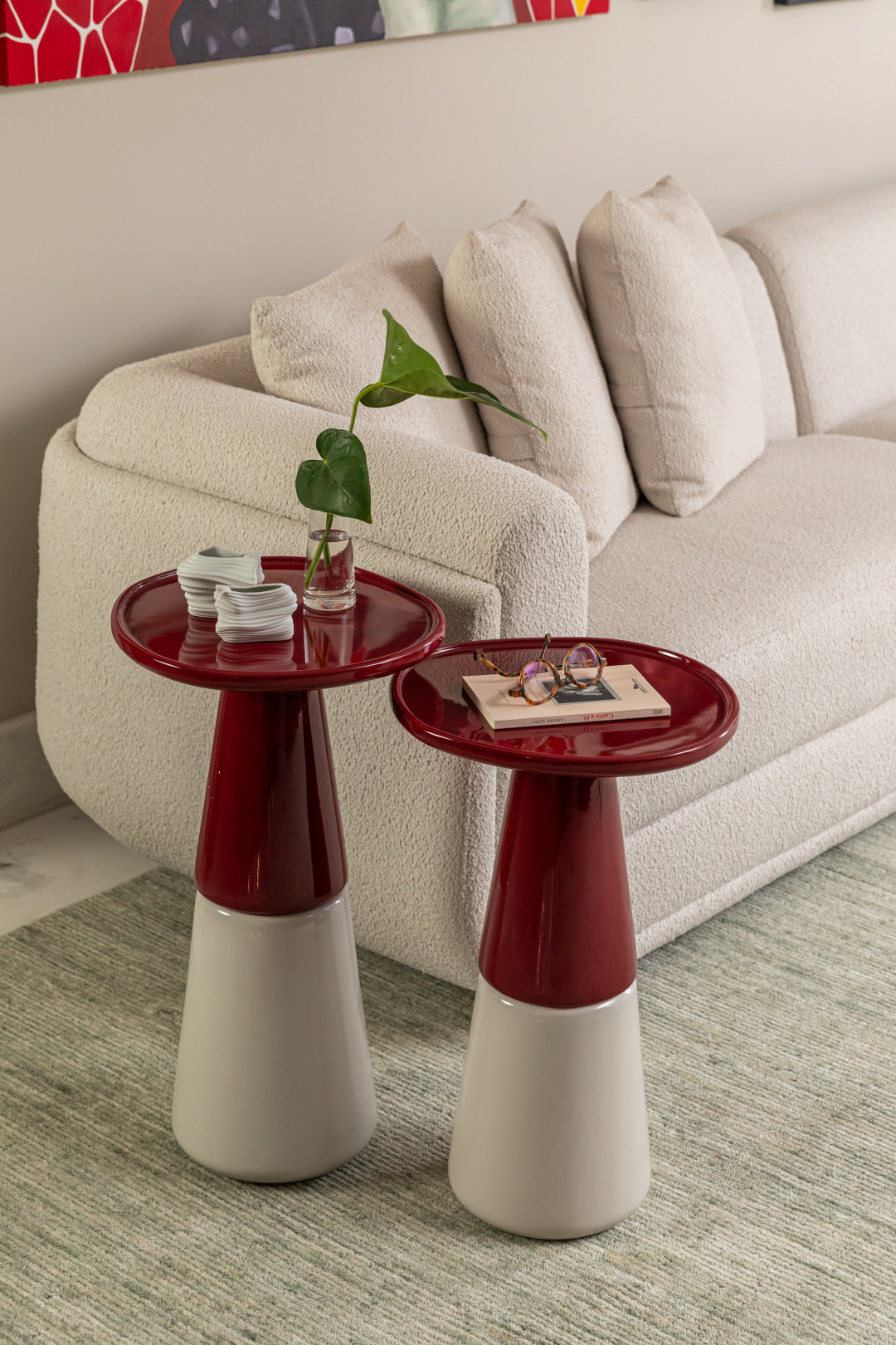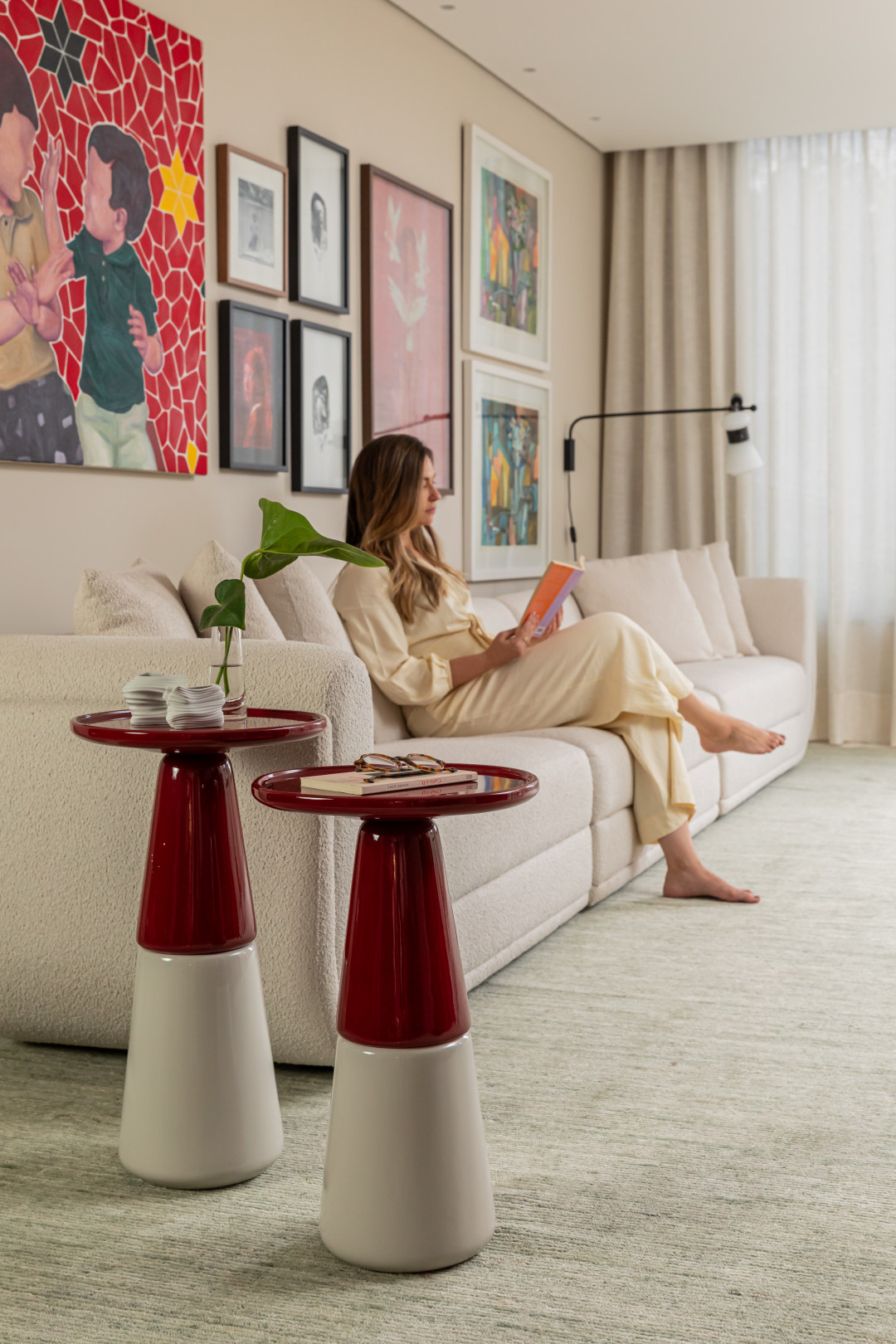 Mesa com tampo e parte superior da base em madeira maciça, MDF laqueado ou texturizado, parte inferior da base também em madeira maciça, MDF laqueado ou texturizado.