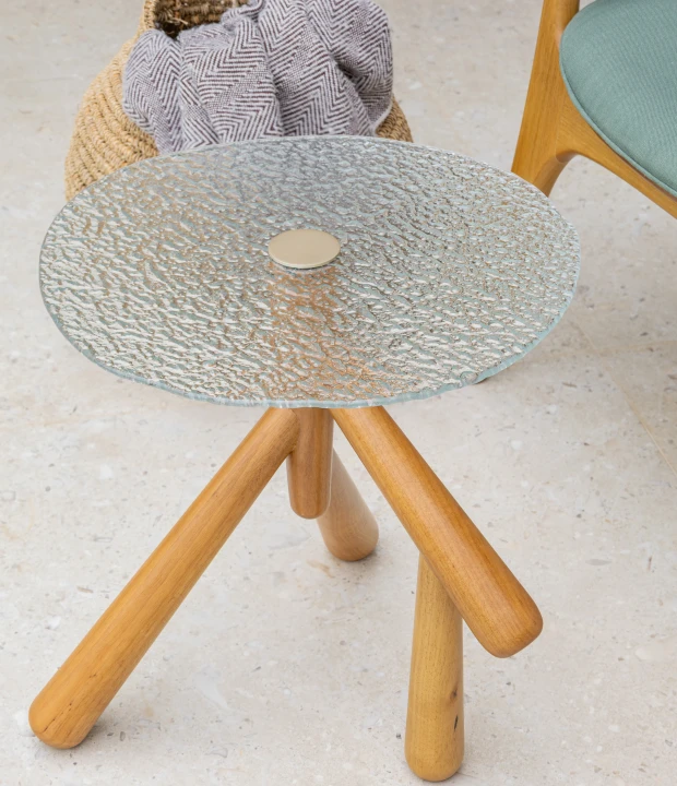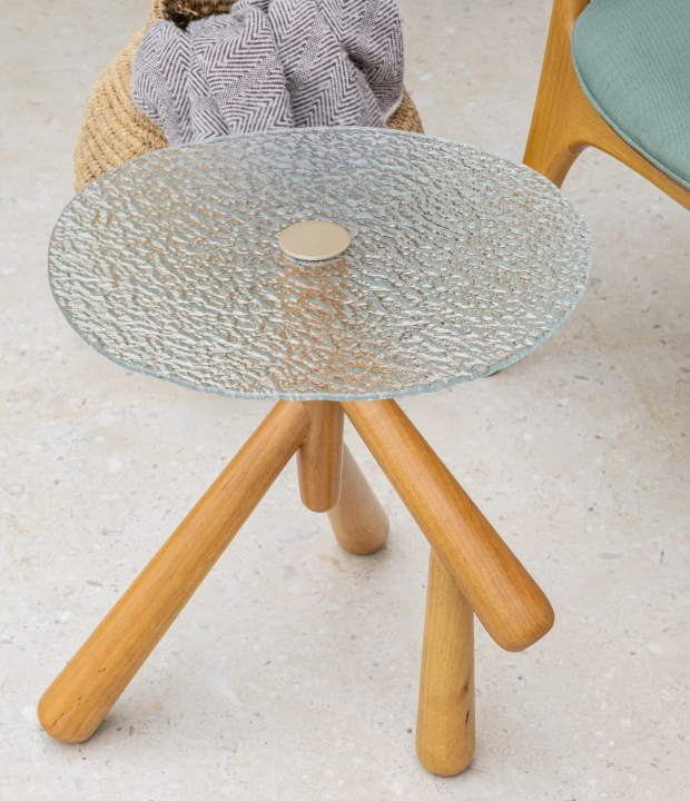 A Mesa lateral Poty é inspirada nos manguezais e na biodiversidade do Delta do Parnaíba, no Piauí. Sua estrutura reflete a beleza e complexidade desse ecossistema, com pernas de madeira de encaixes assimétricos, que lembram as raízes das árvores, e uma superfície em vidro fusin, também disponível em madeira maciça, que remete à conexão dos mangues com a água. Além de sua estética única, a mesa também busca conscientizar sobre a importância da preservação dos manguezais, tornando-se um lembrete visual da necessidade de preservar e valorizar a natureza.