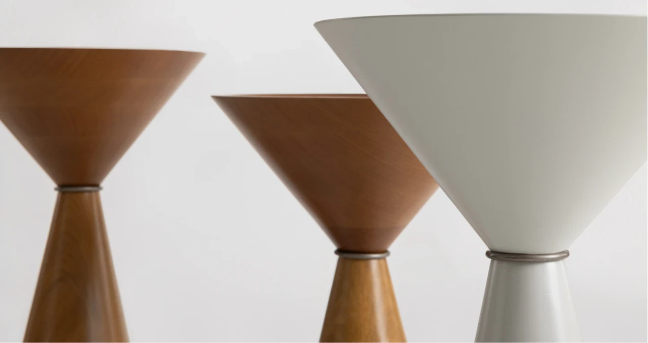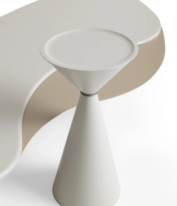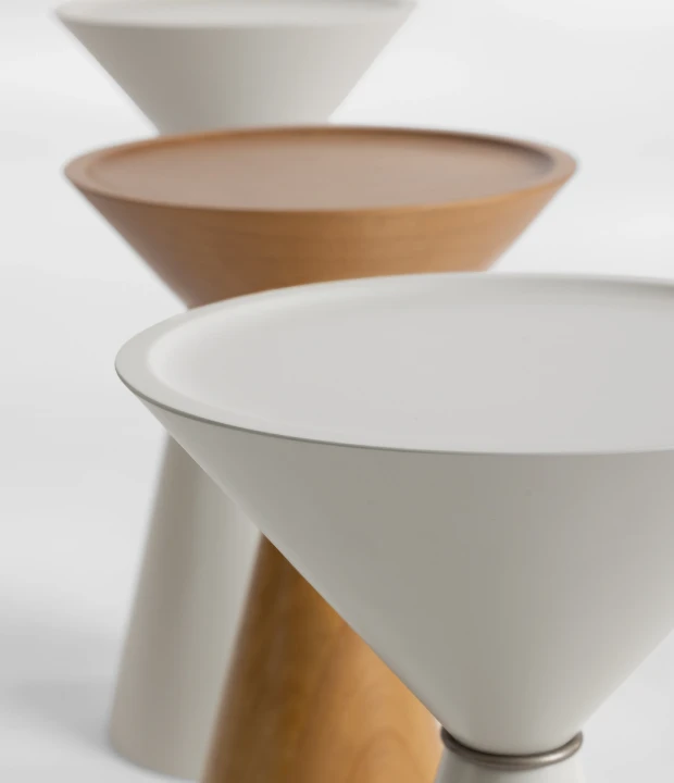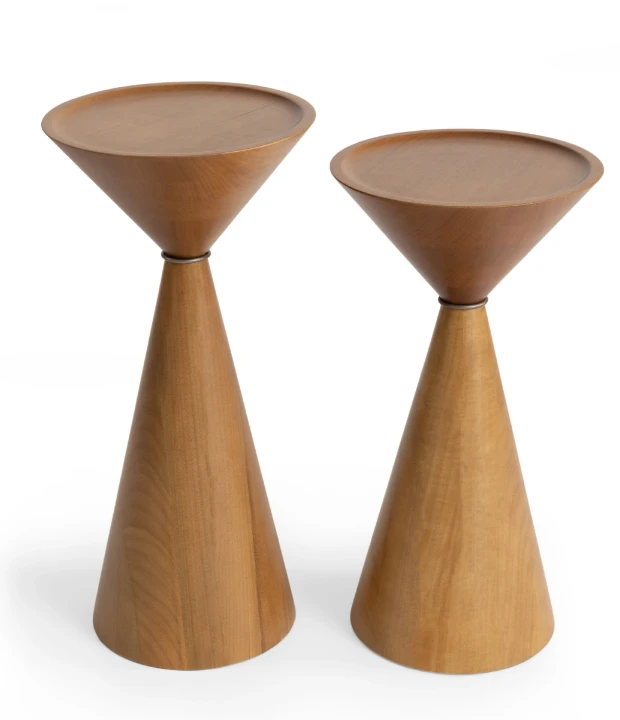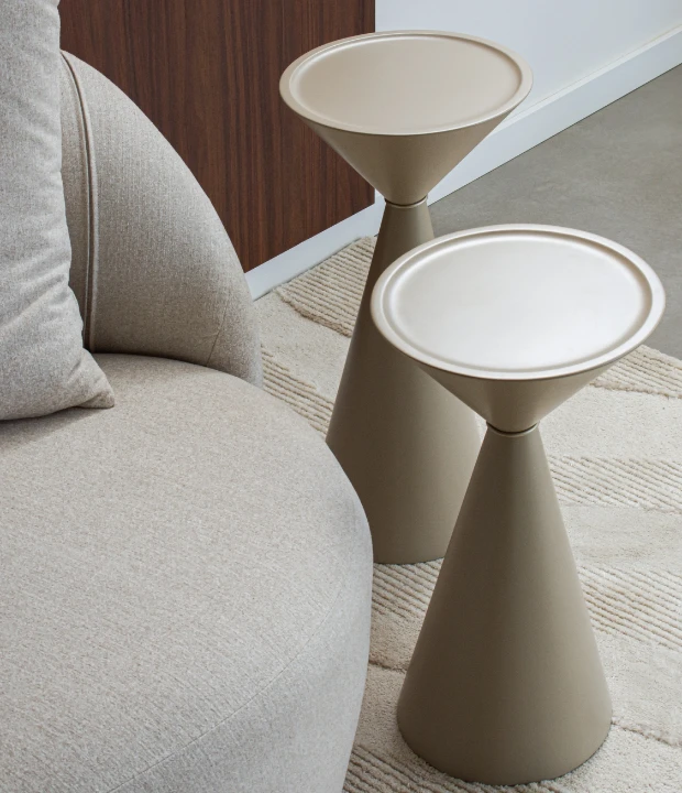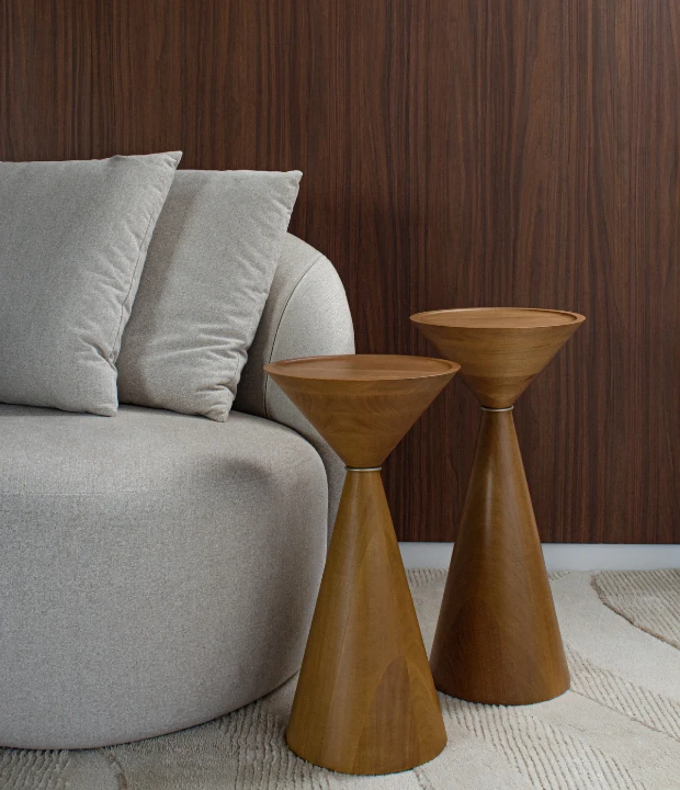 Com um design cônico marcante, a mesa lateral Tule é fabricada em madeira maciça ou MDF laqueado, evidenciando uma refinada argola em metal que delimita o tampo da base. Cada detalhe do design foi minuciosamente pensado para estabelecer uma divisão harmoniosa, resultando em elementos refletidos que acentuam a estética singular da peça.