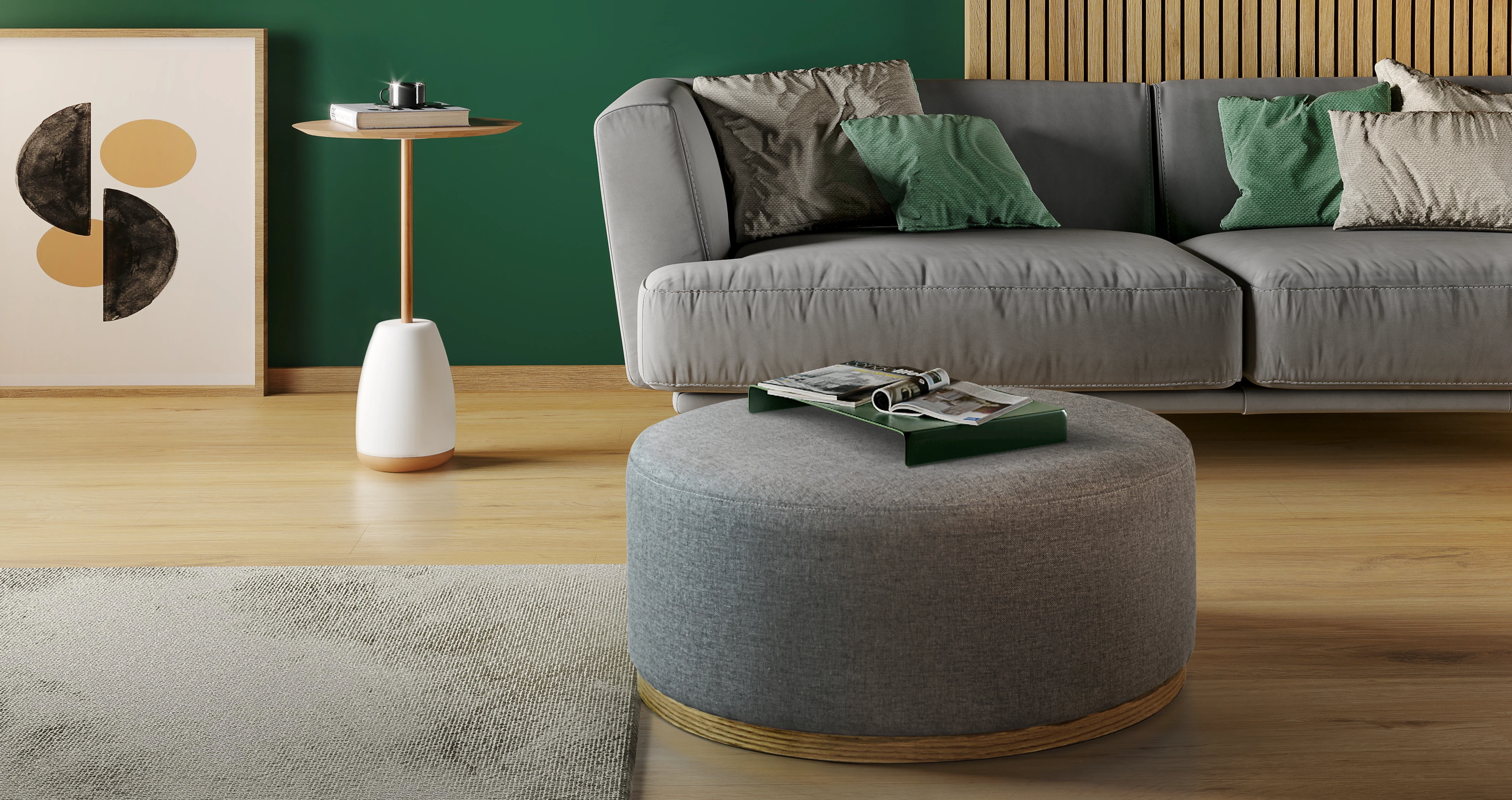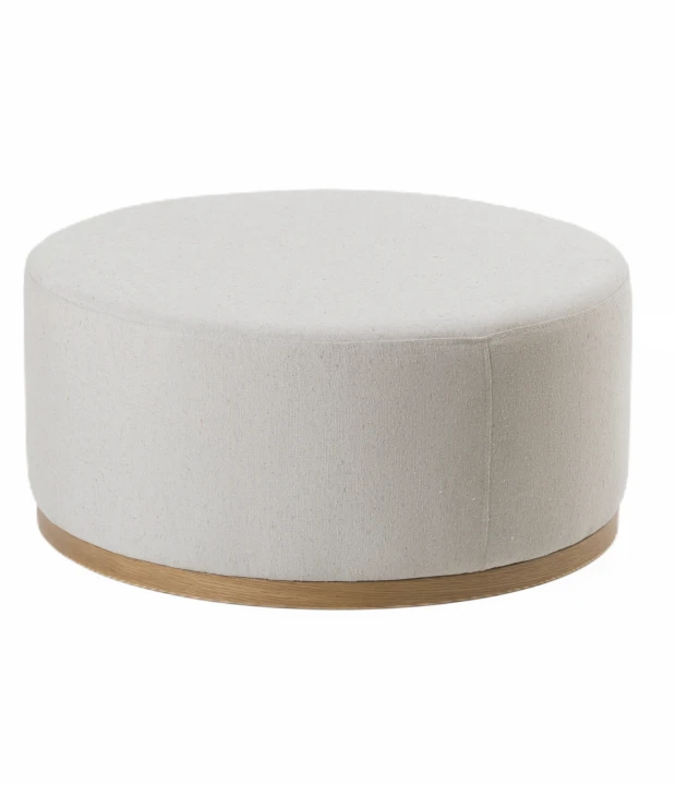 O puff Belli possui assento com espuma D28 e rodapé em MDF revestido com lâmina natural de madeira.