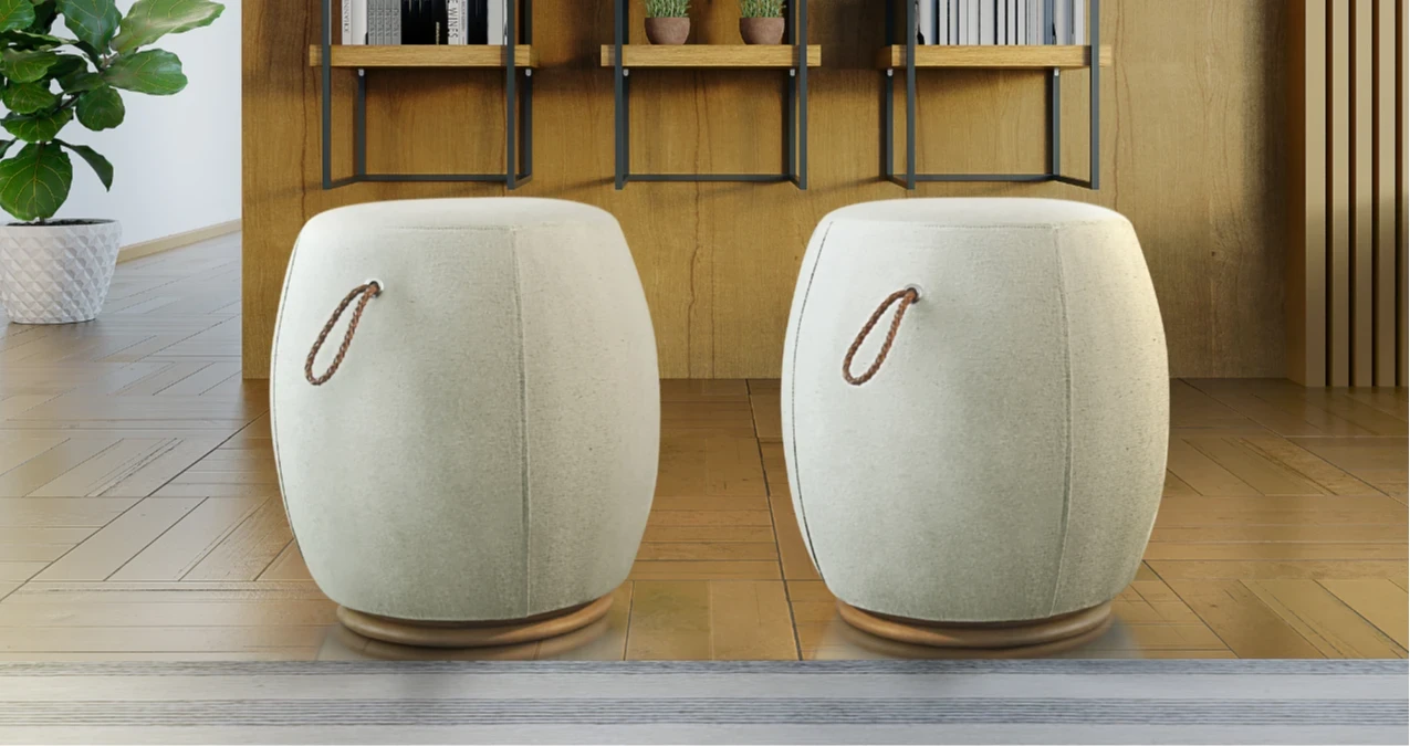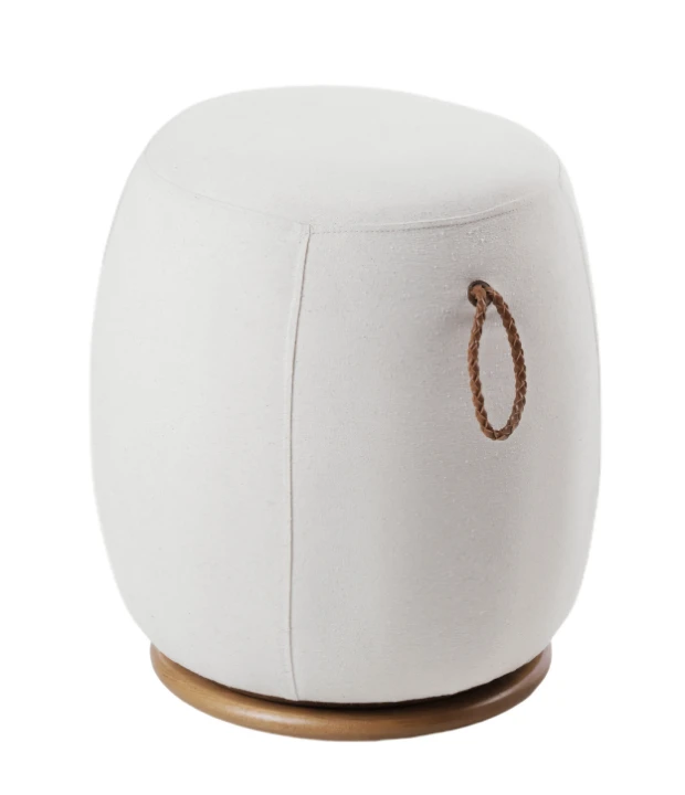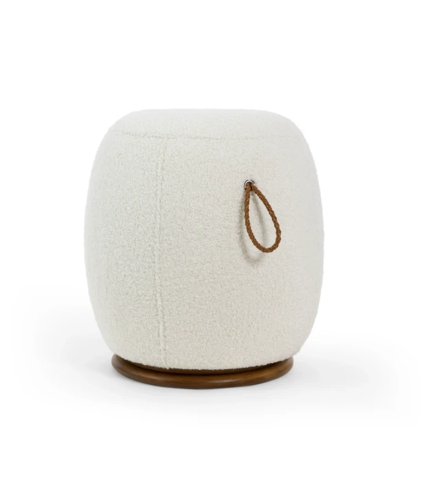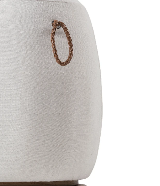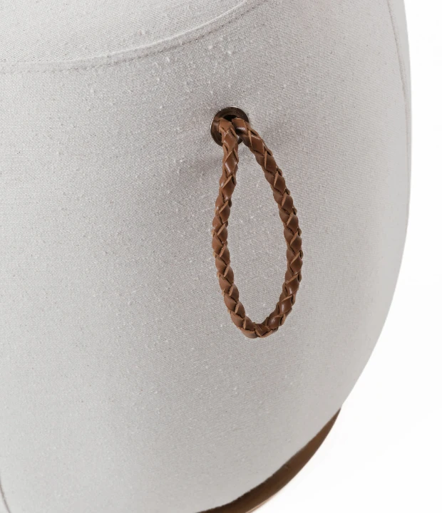 O puff Bongô possui assento com espuma D28 e base em madeira maciça. Dispõe de uma alça trançada confeccionada em couro.